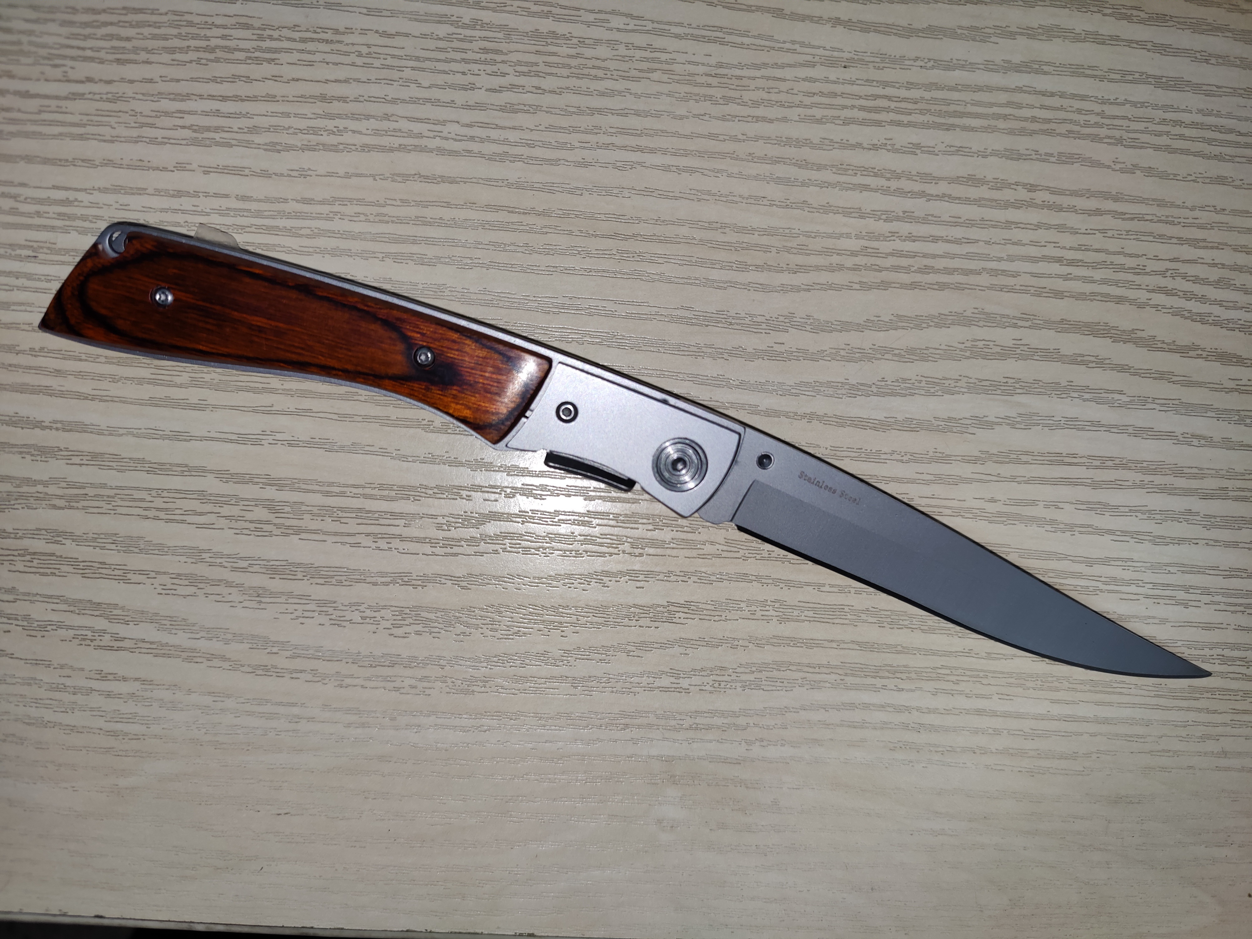 Не подобаються маленькі складані ножики, якими складно відрізати шматок хліба, але і не подобаються великі масивні ножі? З цією моделлю таких проблем не буде. Ніж великий і одночасно легкий і елегантний. Довгий клинок, акуратна рукоять простий, але продуманої форми з дерев'яними накладками прекрасно лежить в руці. Деревина пройшла спеціальну обробку і не боїться вологи. Сама рукоять виготовлена з товстих сталевих пластин і скріплена міцними гвинтами. Для додаткової міцності, у регульованого осьового гвинта, є металеві больстеры.