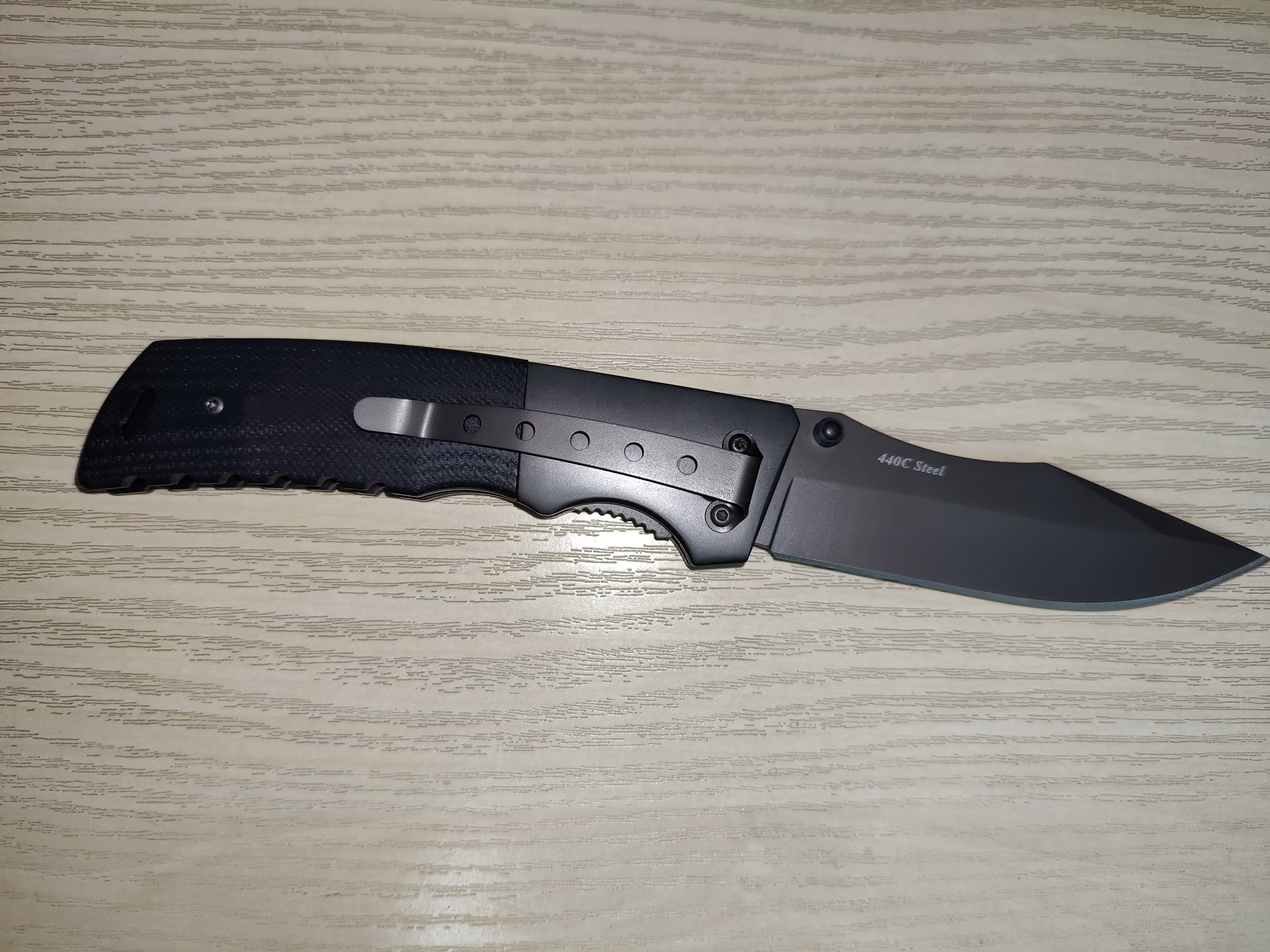 Клинок кишенькового ножа Grand Way, 152003 виконаний із сталі 440 С. Це сплав із високим вмістом вуглецю, яка вже давно використовується на ринку ножовиробництва. У порівнянні з багатьма сучасними сталями її механічні та технологічні характеристики дуже високі. Вона має непогану стійкість до іржавіння, високу твердість на рівні 57-58 одиниць за Роквеллом, гарною міцністю і в'язкістю. Клинок утримує заточування ріжучого краю довго навіть за тривалого використання. Поверхня клинка оброблена чорною порошковою фарбою, стійкою до стирання.